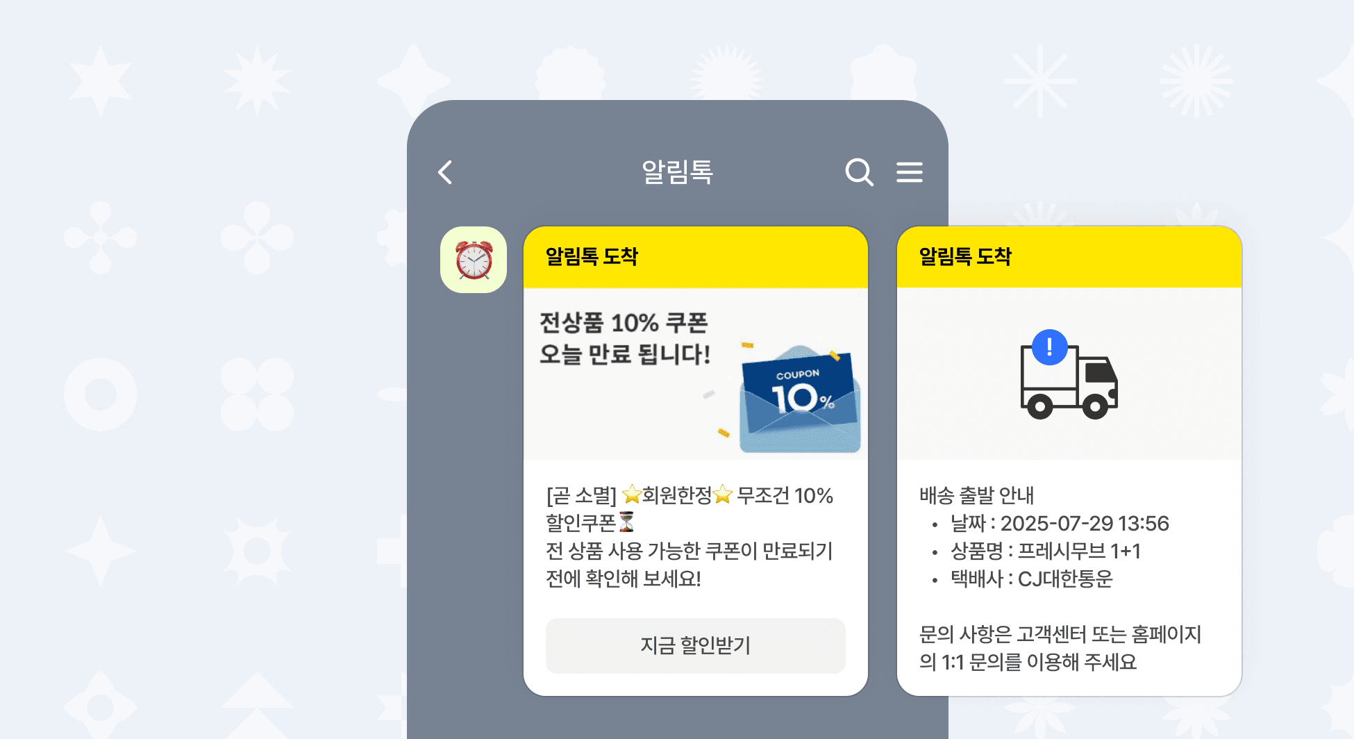 주문, 결제, 배송 등 주요 메시지를 알림톡으로 빠르게 전달해보세요.